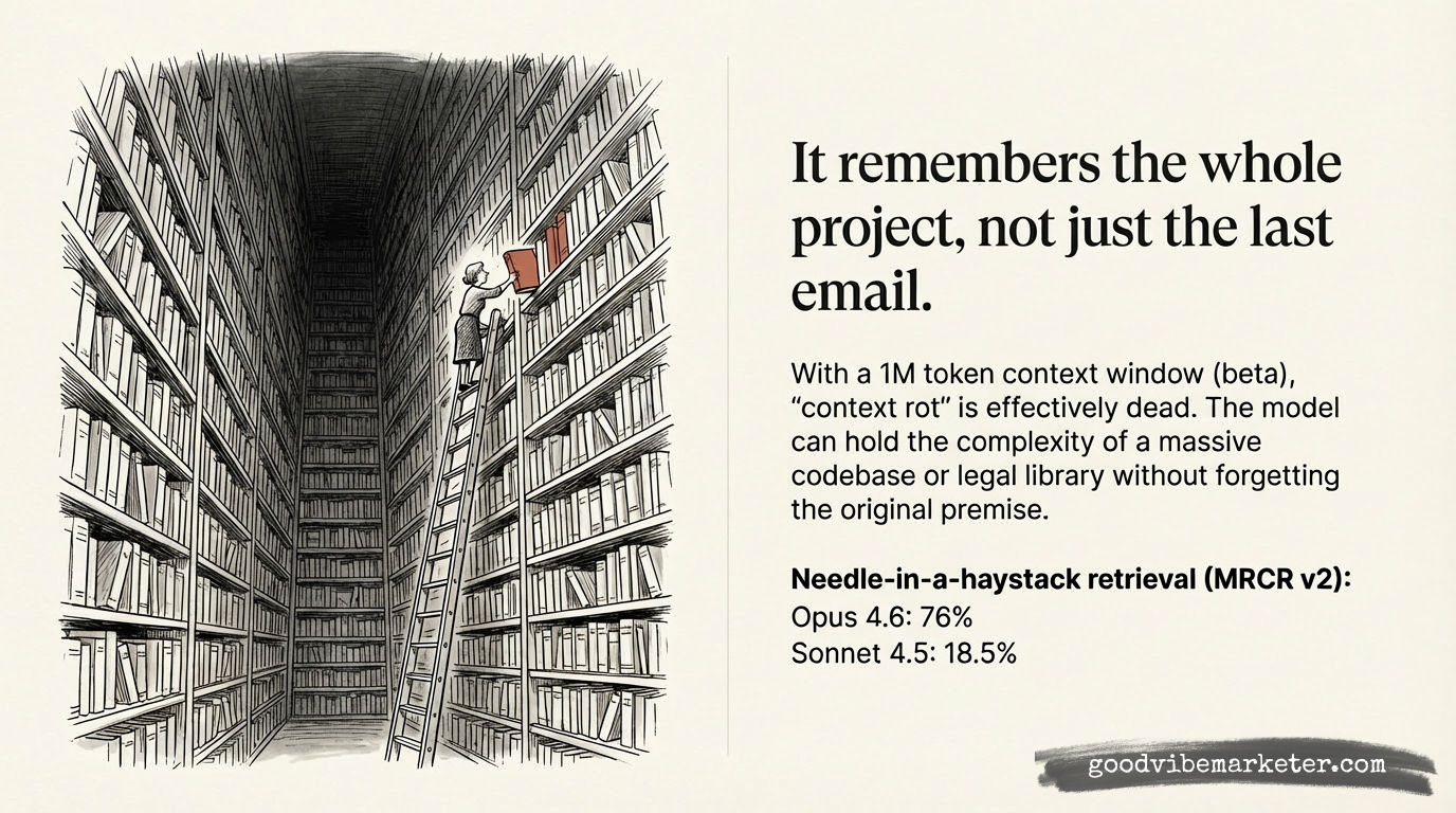 On the MRCR v2 needle-in-a-haystack benchmark, which tests whether a model can find a specific fact buried in huge data sets, Opus 4.6 scored 76 percent. Claude Sonnet 4.5 managed 18.5 percent.